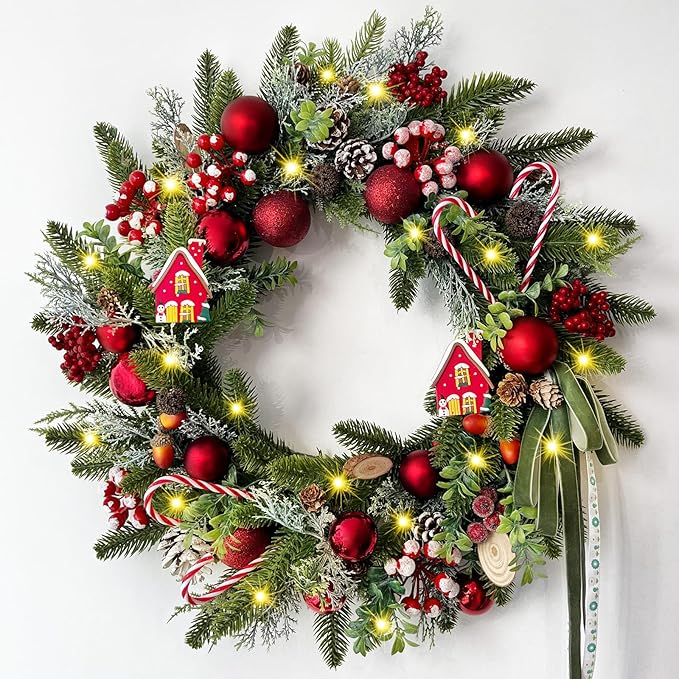 Handcrafted Christmas Light Wreath with Candy Canes & Ornaments